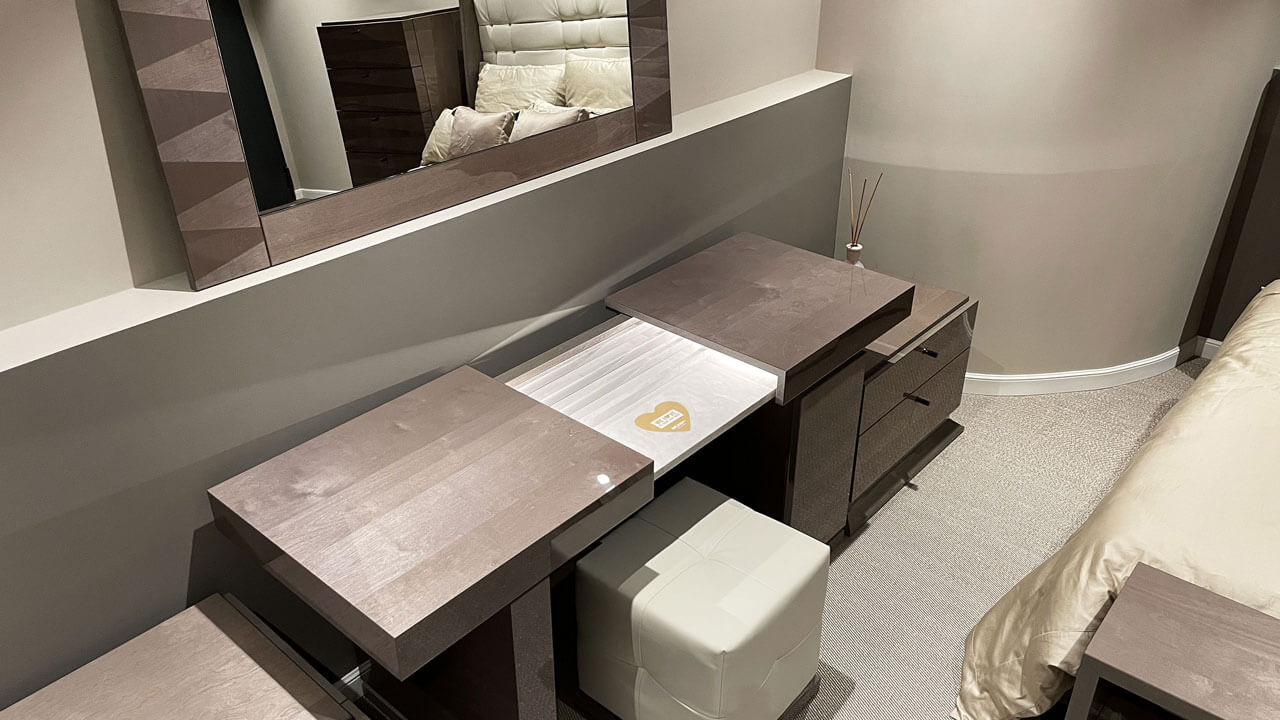 A specially designed spiral staircase leads to a showroom in the form of an exemplary hotel apartment in order to provide ROC DESIGN’s corporate hotel industry clients with an authentic experience. Fitted out with high quality furniture, produced by international manufacturers according to ROC DESIGN design team specifications, they meet the standards of a 4-star accommodation, and that’s not nearly all.